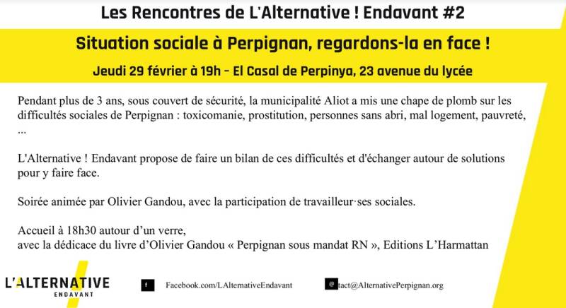L'Alternative! Endavant a organisé le 29 février 2024 un débat sur la situation sociale à Perpignan après une présentation avec d’Olivier Gandou, auteur de « Perpignan sous mandat RN »,