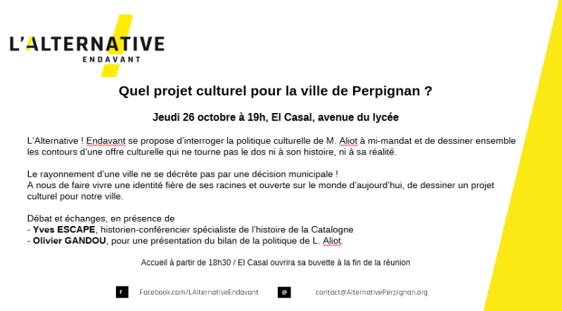 Pour des raisons indépendantes de sa volonté, L'Alternative ! Endavant est amenée à annuler la conférence-débat sur "Quel projet culturel pour Perpignan ?" qui devait avoir lieu ce jeudi 26 octobre, à 17h au Casal.